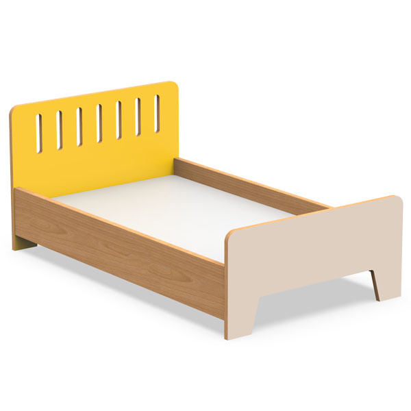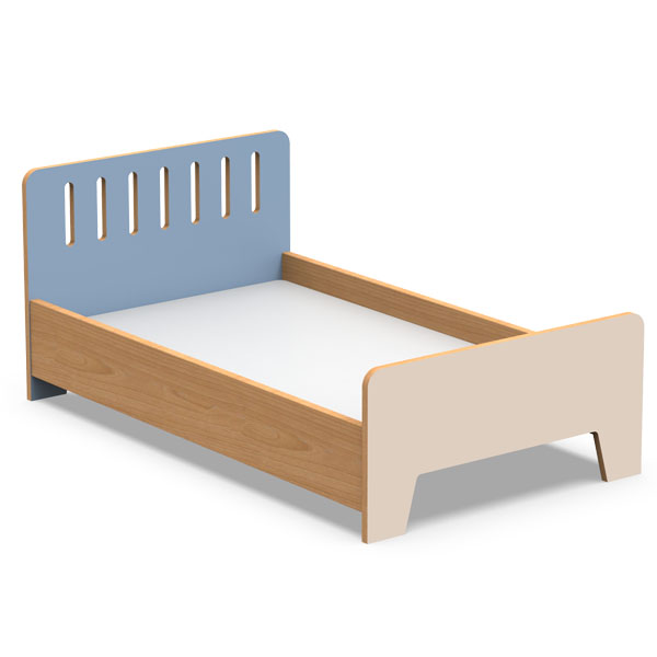 Cabecero y piecero de contrachapado de abedul de 18 mm recubierto de termolaminado, con bordes barnizados y esquinas redondeadas para mayor seguridad. Pies de cama en color beige y cabecero en uno de los colores disponibles.